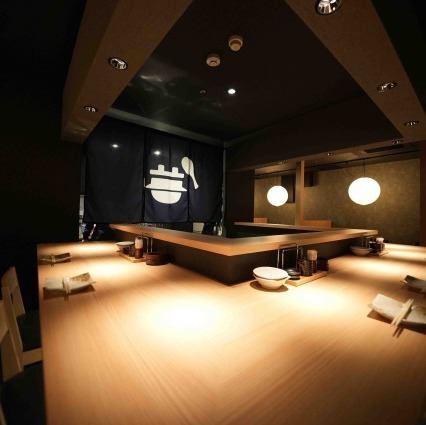 木の温もりと和の設えを基調とした、落ち着いた照明の洗練された空間。「大人の隠れ家」のような雰囲気は、デートや会食に最適とご好評です。ゆったりと上質な時間をお過ごしください。